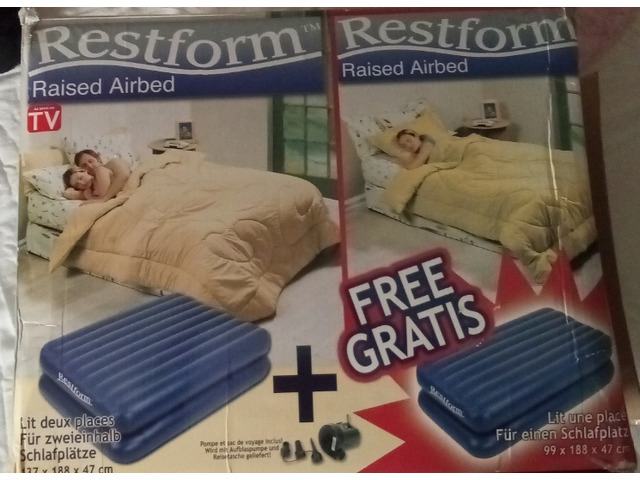 Se vende un pack de 2 colchones hinchables restform nuevos y sin usar con bomba de inflado y desinflado las medidas del producto son ancho 137×188×47 centímetros y otra es 99×188×47 con material nailon uno de ellos es doble incluyen 3 almohadas pequeñas para las cervicales es ideal para invitados viajes huéspedes inesperados niños camping piso de estudiantes apartamento pequeño caravana casa de campo etc Interesados llamar al TELF: 670355735